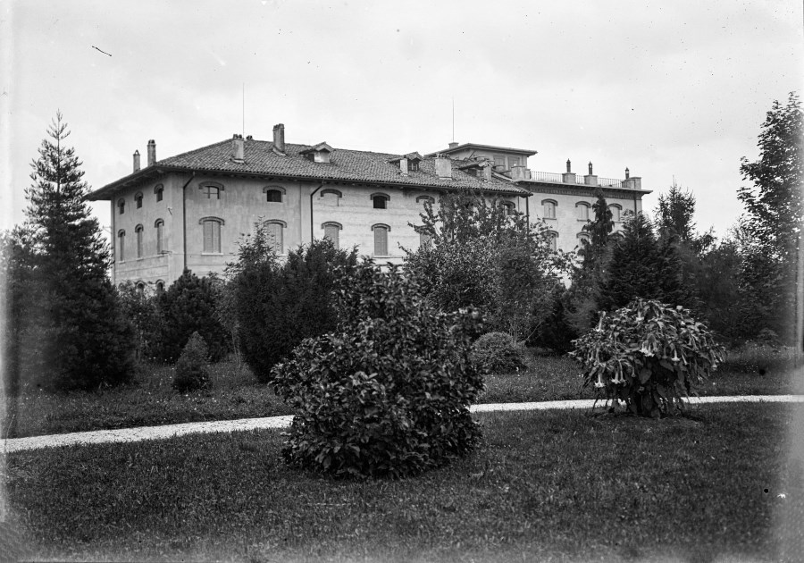 Veduta di una villa inserita all'interno di un giardino.