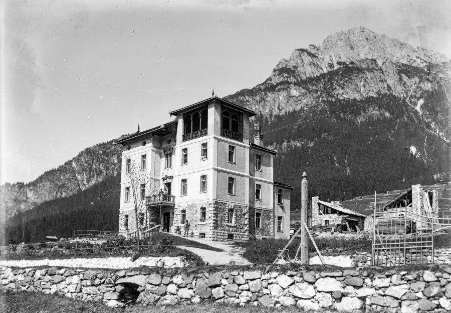 Veduta di una villa di montagna con persone ritratte nella terrazza e nelle finestre.