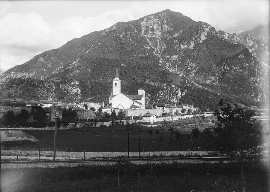 Veduta del Duomo di Venzone, della cinta muraria, delle abitazioni, dei binari in primo piano e delle montagne come fondale.