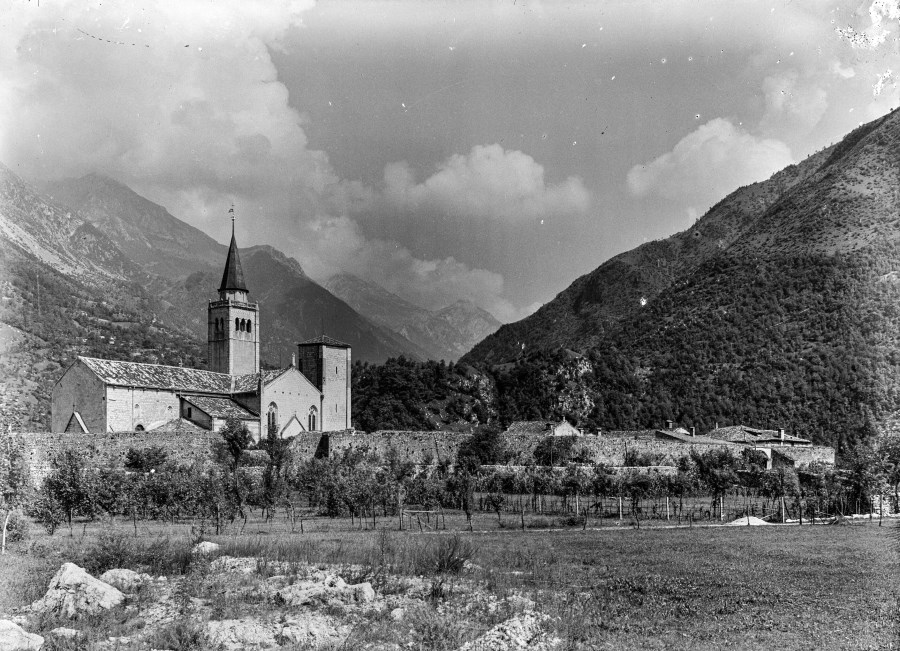Veduta del Duomo di Venzone, della cinta muraria, dei tetti delle abitazioni, della vigna fuori dalle mura e dalle montagne sullo sfondo.
