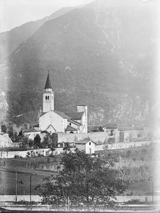 Veduta del Duomo di Venzone, della cinta muraria, dei tetti delle abitazioni, della vigna fuori dalle mura e delle montagne sullo sfondo.