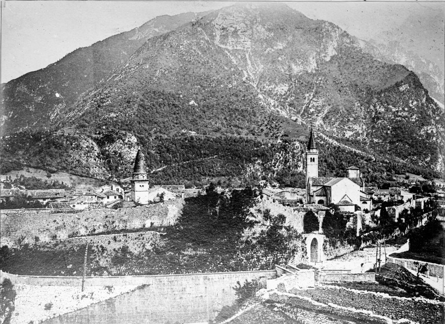 Veduta del Duomo di Venzone, della Chiesa di San Giovanni Battista, della cinta muraria, dei tetti delle abitazioni e delle montagne sullo sfondo.