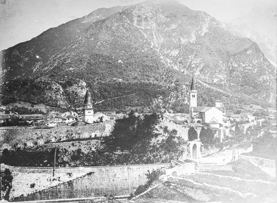 Veduta del Duomo di Venzone, della Chiesa di San Giovanni Battista, della cinta muraria, dei tetti delle abitazioni e delle montagne sullo sfondo.