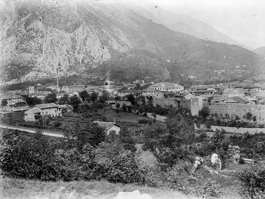 Veduta della cittadina di Venzone, della cinta muraria, dei binari del treno, delle abitazioni e della montagna sullo sfondo, prima del sisma del 1976 che distrusse gran parte degli edifici della città.