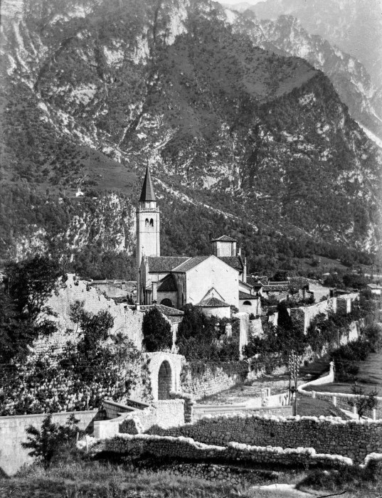 Veduta del Duomo di Venzone, della cinta muraria e della abitazioni prima del sisma del 1976 che distrusse gran parte degli edifici della città.