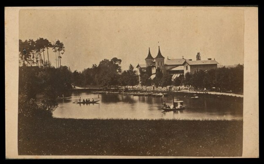 Veduta lacustre con piccole imbarcazioni ed un edificio con torri simili ad un castello sulle rive del lago.