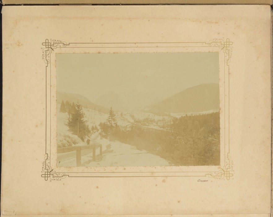 Un uomo passeggia su un sentieri innevato; sullo sfondo dell'immagine un piccolo paese e le montagne ricoperte di neve.