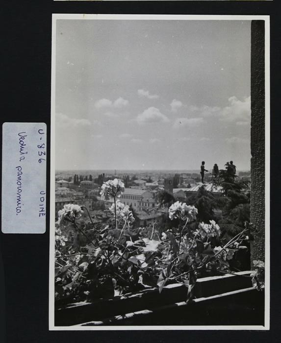Udine: panorama della città. In primo piano, fiori su un balcone. In secondo piano a destra, la Torre dell'Orologio, di Giovanni da Udine (1527), che appartiene alla Loggia di San Giovanni. In cima ad essa, i due Mori e, in mezzo a loro, una campana. Al centro, la chiesa di San Francesco e il campanile (seconda metà del XIII secolo).