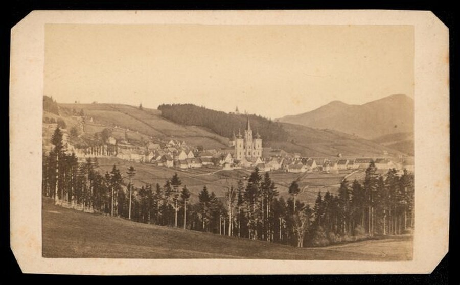 Veduta panoramica del paesino di Mariazell situato fra le colline montuose della regione della Stiria in Austria.