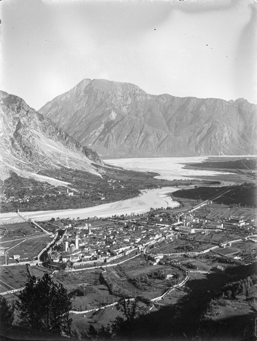 Veduta panoramica dell'abitato di Venzone, del ponte-passerella verso Pioverno a sinistra e parte del Monte San Simeone, del fiume Tagliamento e, a destra, del Monte Amariana. Il punto di ripresa è probabilmente da una delle due chiese dietro Venzone: la Chiesa di Santa Caterina oppure la Chiesa dei Santi Giacomo e Anna.