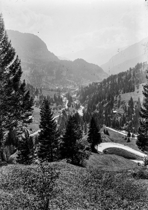 Veduta panoramica di montagna con una strada che affianca il greto di un torrente che arriva a valle.