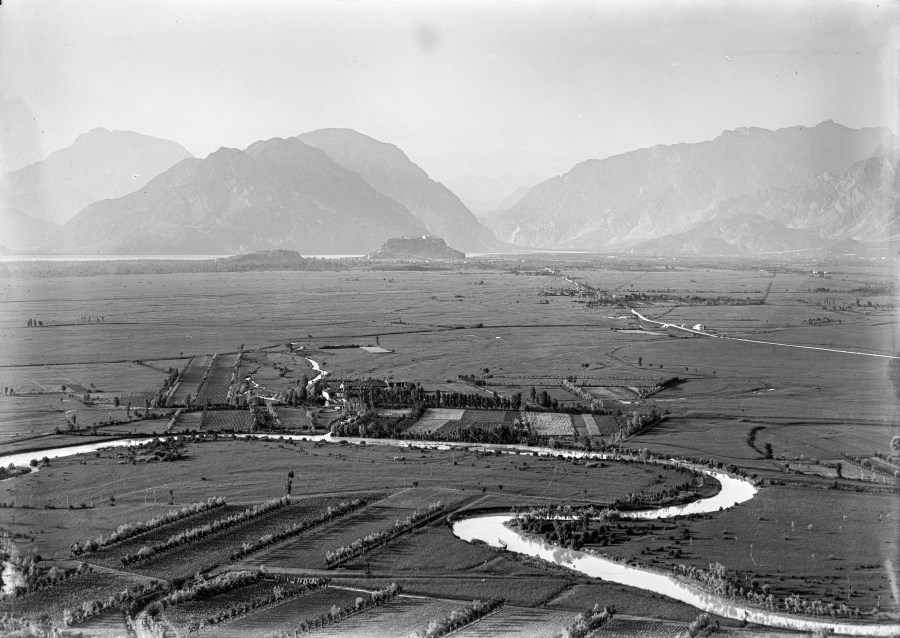 Veduta panoramica sulla pianura dal Castello di Susans: sullo sfondo il colle di Osoppo, il greto del fiume Tagliamento e le montagne.
