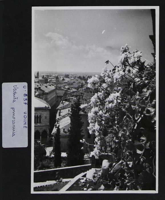 Udine: panorama della città. A sinistra si intravede la Loggia del Lionello, finita di costruire per volere di Nicolò Lionello. In primo piano a destra, fiori su un balcone. In basso, scalinata che conduce al castello, dove si trova una signora che cammina.