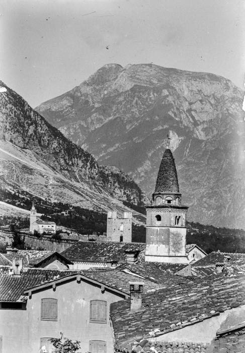 Veduta sopraelevata fra i tetti delle case di Venzone: a spuntare tra i tetti è il campanile della Chiesa di San Giovanni Battista (crollato durante il sisma del 1976 e mai più ricostruito), una delle torri della cinta muraria e sullo sfondo la Chiesa del borgo di Pioverno. Nella parte superiore l'immagine è incorniciata dalle montagne.
