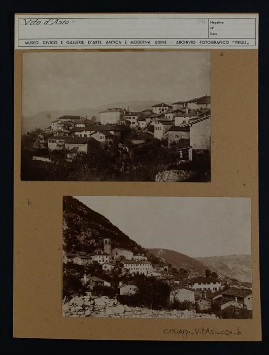 Vito d'Asio: due vedute con abitazioni, la Val d'Arzino e il Monte Asio in secondo piano (nella fotografia "b", dove a sinistra compare la chiesa parrocchiale di San Michele Arcangelo).