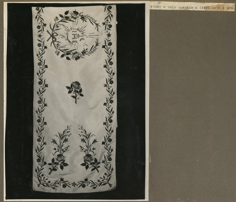 Riproduzione fotografica di un velo omerale di seta con decorazioni floreali in oro conservato nella Chiesa di San Nicolò Vescovo a Fiume Veneto.