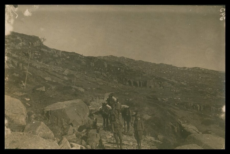 Tre soldati intenti nel trasporto verso il cimitero, di salme di caduti della Prima Guerra mondiale caricate a dorso di mulo