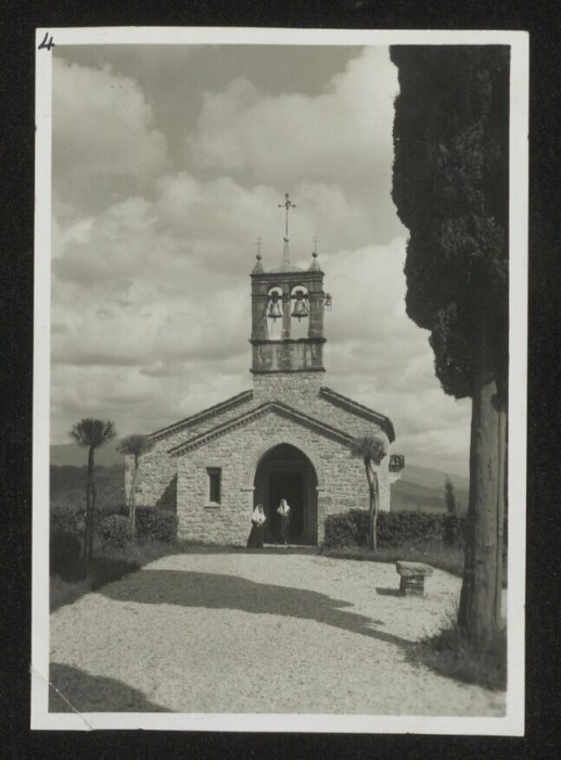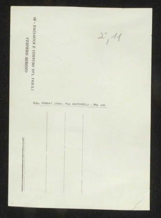 Lo scatto di Umberto Antonelli, farmacista e fotografo attivo in Carnia tra 1909 e 1949, è parte della serie di cartoline pubblicate dal fotografo editore Carlo Pignat con il titolo "Paesaggi e Costumi del Friuli" nella seconda metà degli anni Trenta del Novecento, raffiguranti tutte una Carnia e un Friuli arcadici. La Chiesa ritratta è quella di Sant'Eufemia a Segnacco, frazione di Tarcento.