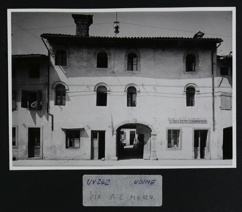 Udine, via Anton Lazzaro Moro: edificio realizzato in stile lombardo di origine probabilmente cinquecentesca con finestre ad arco. In basso a destra, un negozio che vende pane, latte e alimentari. In basso al centro, l'ingresso principale che dà alla corte interna, in cui si intravedono due donne che interagiscono tra di loro.