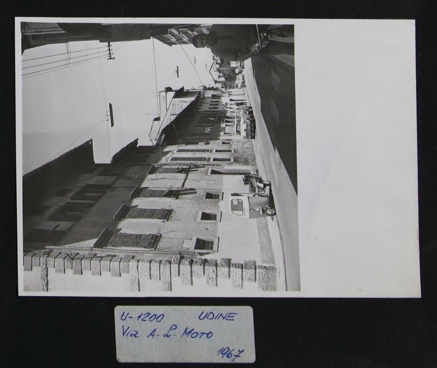 Udine: veduta di via Anton Lazzaro Moro. A sinistra, un motocarro e si intravede Palazzo Montegnacco-Berghinz-De Concina, sito tra via Francesco Mantica e via Anton Lazzaro Moro, realizzato in pietra piasentina e bugnato rustico. L'edificio, che in origine venne fatto costruire dal conte Girolamo di Montegnacco, ospitò il generale Armando Diaz. In primo piano a destra, un signore in bicicletta.