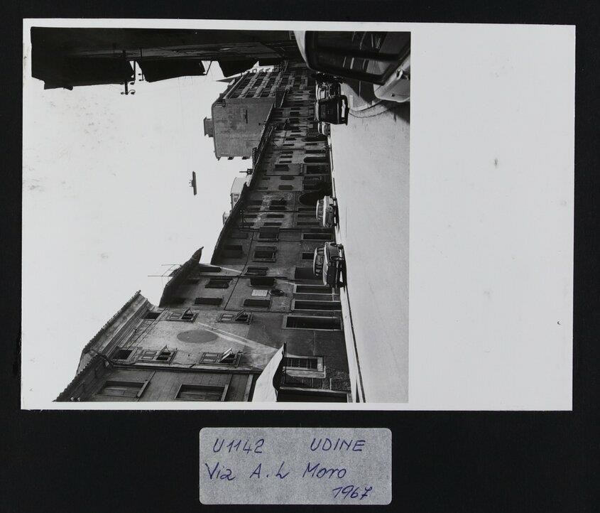 Udine: veduta di via Anton Lazzaro Moro. A sinistra, sulle pareti esterne delle prime due case, un affresco seicentesco rappresentante la Madonna col Bambino in apparizione a San Francesco e Santa Chiara e l'epigrafe dedicata a Giovan Battista Periz, vissuto lì, medaglia d'argento al Valor Militare alla memoria (subito sotto, una corona d'alloro). Sullo sfondo a destra si intravede il campanile della chiesa parrocchiale del Santissimo Redentore.