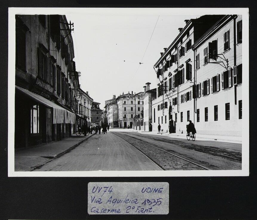Udine: veduta di via Aquileia. In primo piano, le rotaie per il tram. Nello scatto si vedono una carrozza con i cavalli e due biciclette. In primo piano a sinistra, una tipografia. In fondo a destra, le quattro sculture in pietra poste sulle colonne della recinzione all'ingresso di Palazzo Pontoni, all'angolo tra via Piave e via Aquileia. Sempre a destra, in primo piano, Casa D'Arcano, ospitante la la caserma "Gerolamo Savorgnan" della Seconda Fanteria, un tempo sede di una raffineria di zucchero e di una piccola chiesa. A sinistra, di fronte a Palazzo Pontoni, Casa de Rubeis-Perusini, con la facciata su via Gorghi che presenta finestre balaustrate. Il palazzo, che propone gli stilemi degli primi anni del XVIII secolo, aveva anche ospitato il Cinema Moderno, chiuso nel 1962. Accanto, Palazzo Trento-Girardis, in origine degli Antonini, a tre piani con trifora al centro.