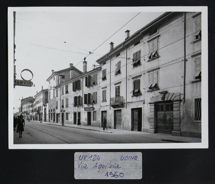 Udine: veduta di via Aquileia. In primo piano a sinistra, l'insegna che reca la denominazione "Marvin". A sinistra, sul lato dei palazzi, Casa Arcano-Varmo-Buiatti. Inizialmente venne abitata dalla famiglia Tracanelli verso la metà del XVII secolo. Lo scatto risale a un periodo precedente rispetto alla seconda guerra mondiale, quando l'abitazione subì dei danni che comportarono il restauro del bene. Il portale in bugnato con stemma sulla sommità era stato l'ingresso dell'azienda Bardahl, che vendeva un olio lubrificante per motori.