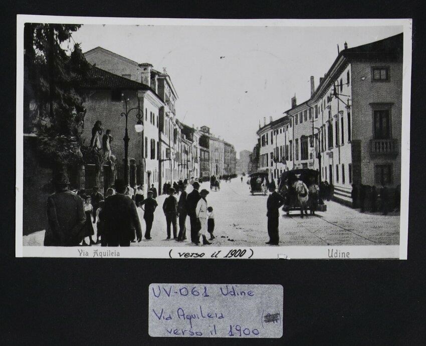 Udine: una cartolina riprodotta che rappresenta uno scatto di via Aquileia. Diverse persone camminano lungo la via. A destra, due carrozze con i cavalli (un'altra è in lontananza al centro) e Casa de Rubeis-Perusini, con la facciata su via Gorghi che presenta finestre balaustrate. Il palazzo, che propone gli stilemi degli primi anni del XVIII secolo, ospiterà il Cinema Moderno, chiuso nel 1962. Accanto, Palazzo Trento-Girardis, in origine degli Antonini, a tre piani con trifora al centro.