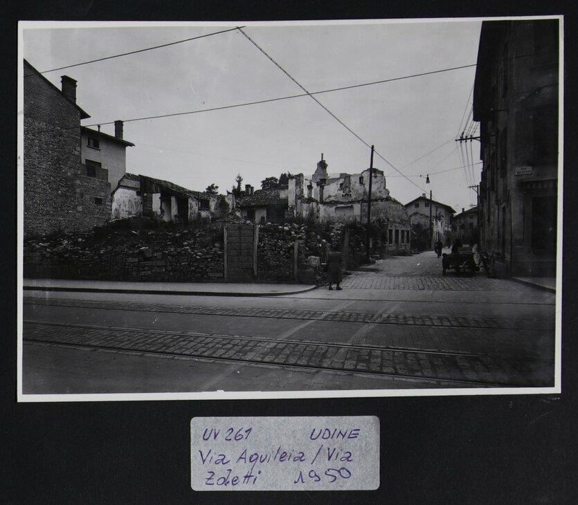 Udine: veduta di via Zoletti e di via Aquileia con diverse macerie, generate dagli attacchi della seconda guerra mondiale. A destra, un cavallo che traina un carro.