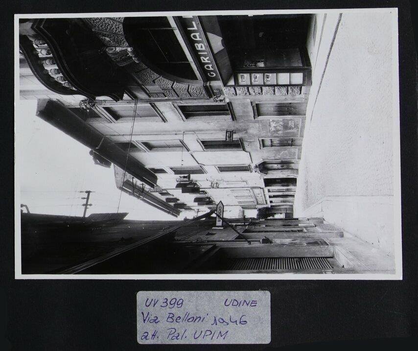 Udine, via Antonio Belloni: veduta di uno scorcio con abitazioni storiche. In primo piano a destra, si intravede il palazzo dove aveva sede il cinema Eden in stile liberty, costruito su progetto dell'architetto Provino Valle (1921) e demolito nel 1958 a favore del palazzo ex Upim. A sinistra, l'insegna "Rifugio". Verso il centro, Casa Belloni, dove c'erano una scuola di taglio e la sartoria Stella.