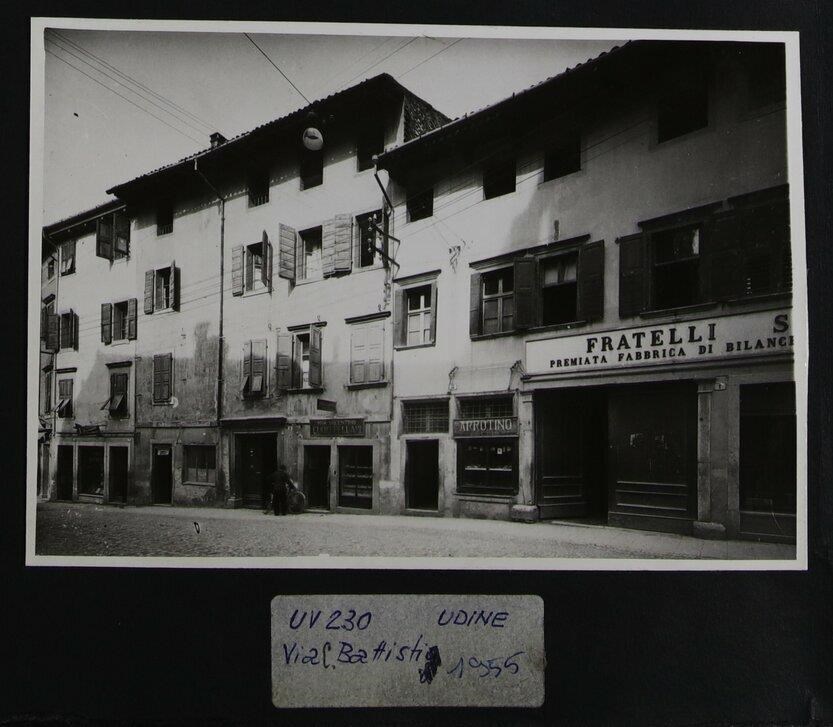 Udine: veduta di via Cesare Battisti, in cui è presente un signore con la sua bicicletta. Tra le attività commerciali affacciate sulla strada, c'è quella di un arrotino.