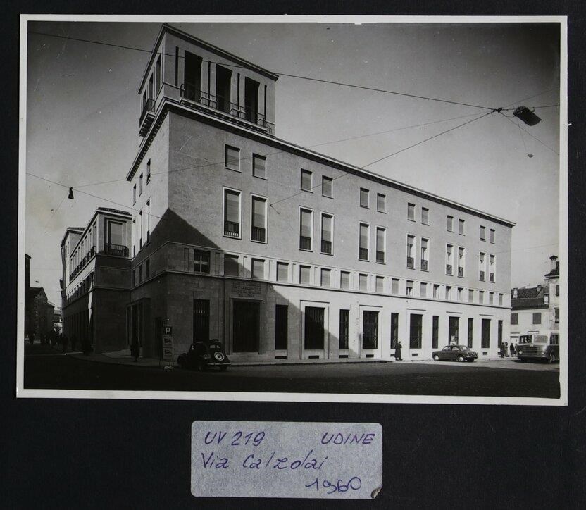 Udine, via Calzolai: in piazza del Duomo, l'edificio sede dell'INAIL, probabilmente frutto del Piano Regolatore del 1938. Davanti al palazzo, due automobili d'epoca e un mezzo di trasporto pubblico.