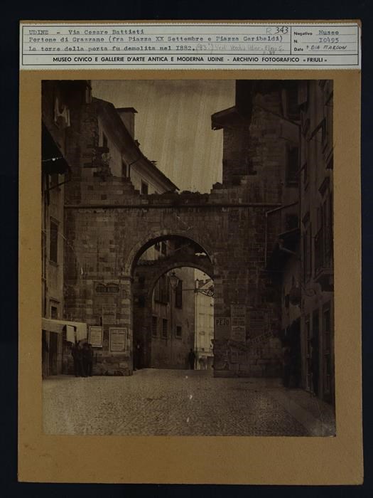 Udine: porta Grazzano (medievale), tra piazza Garibaldi e piazza XX Settembre, con lo stemma della città di Udine, sopra l'arco a tutto sesto (terza cerchia muraria). Ai lati della porta, affissioni pubbliche, tra cui quella della lotteria nazionale, dell'acqua Pejo e relativa al necrologio di Giuseppe Garibaldi. Nella fotografia si possono notare otto uomini. La torre non compare poiché demolita nel 1882.