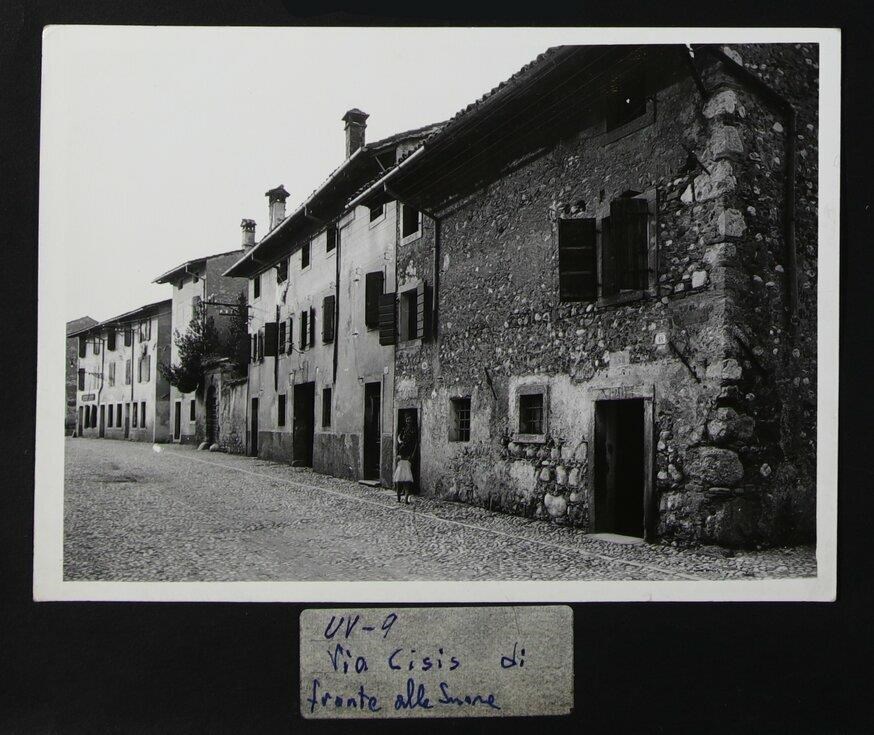 Udine: veduta di via Cisis, di fronte all'Istituto Suore della Beata Vergine Maria Regina del Santissimo Rosario (1925). Al centro, sull'uscio di una casa, una donna che guarda verso l'obiettivo e una bambina di schiena che le rivolge lo sguardo.
