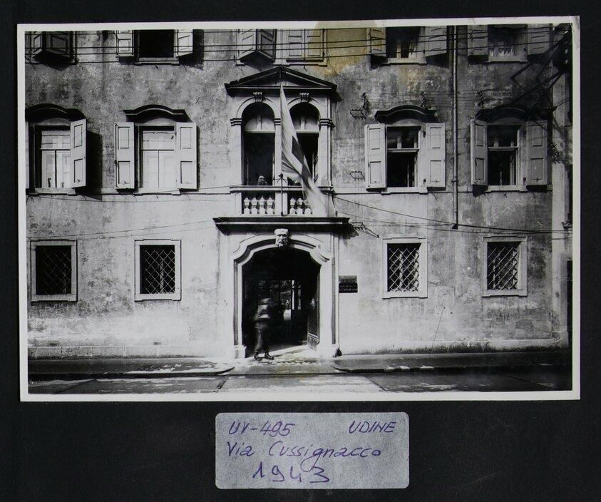 Udine, via Cussignacco: veduta, all'incrocio con piazza Garibaldi, della facciata di Casa de Puppi, demolita negli anni Sessanta a favore della costruzione di un altro edificio. Davanti all'ingresso, un signore. Sul balcone della bifora, bandiera con il simbolo dei Savoia.