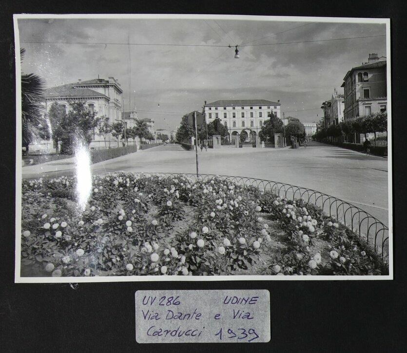Udine: veduta di via Dante e via Giosuè Carducci. A sinistra si intravede la scuola elementare al tempo intitolata a Vittorio Emanuele III, ora a Dante Alighieri (1902-1905), nell'ex “Braida Codroipo“. In secondo piano, il Giardino "Giovanni Pascoli" progettato da Ettore Gilberti (inizi degli anni Trenta del Novecento), in origine chiamato "Giardini pubblici Arnaldo Mussolini", e la Casa del Littorio, costruita sotto la direzione dei lavori di Ettore Gilberti (1931-1932). In secondo piano a destra, Palazzo del Torso dell'architetto Provino Valle (1925-1926), sito in via Giosuè Carducci 44, inizialmente di proprietà dei Conti del Torso. L'edificio, realizzato in stile neopalladiano, presenta un timpano con sculture a tutto tondo e stemma famigliare. Più indietro, la casa e bottega del fotografo Attilio Brisighelli e Palazzo Vuga dell'architetto Ettore Gilberti (1910).