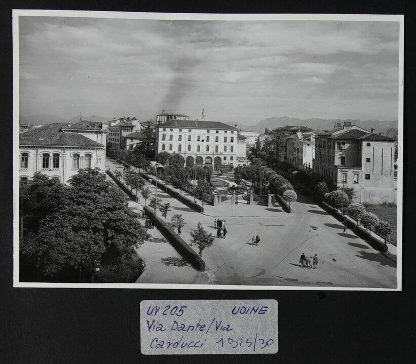 Udine: veduta dall'alto del Giardino "Giovanni Pascoli" progettato da Ettore Gilberti (inizi degli anni Trenta del Novecento) , in origine chiamato "Giardini pubblici Arnaldo Mussolini". A sinistra si intravede la scuola elementare al tempo intitolata a Vittorio Emanuele III, ora a Dante Alighieri (1902-1905), nell'ex “Braida Codroipo“. Sempre a sinistra, sullo sfondo, Palazzo Agricola (degli inizi del Novecento), e Palazzo Fior, edificio pluripiano dell'architetto Benvenuto Elia Fior (1935). In secondo piano, al centro, la Casa del Littorio, costruita sotto la direzione dei lavori di Ettore Gilberti (1931-1932). A destra Palazzo del Torso dell'architetto Provino Valle (1925-1926), sito in via Giosuè Carducci 44, e inizialmente di proprietà dei Conti del Torso. L'edificio, realizzato in stile neopalladiano, presenta un timpano con sculture a tutto tondo e stemma famigliare. Più indietro, la casa e bottega del fotografo Attilio Brisighelli e Palazzo Vuga di Ettore Gilberti (1910).