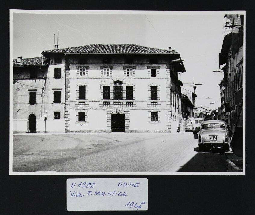 Udine, via Francesco Mantica: veduta di Palazzo Montegnacco-Berghinz-De Concina, sito tra via Francesco Mantica e via Anton Lazzaro Moro, realizzato in pietra piasentina e bugnato rustico. L'edificio, che in origine venne fatto costruire dal conte Girolamo di Montegnacco, ospitò il generale Armando Diaz.