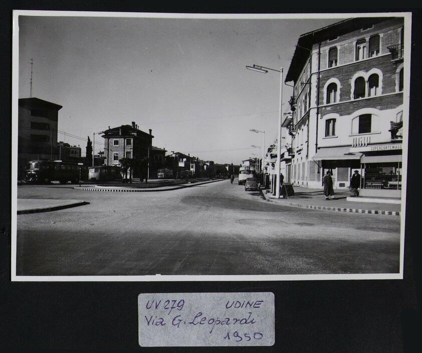 Udine: veduta di viale Giacomo Leopardi. In primo piano a destra, una sede Agip. A destra, lampioni in prospettiva lungo la strada. In secondo piano a sinistra, al civico 18, Villa Vidal dell'architetto Ettore Gilberti (1934), commissionata da Vittorio Vidal e sviluppata su tre piani. Nelle vicinanze altri villini, costruiti dopo che le mura della città vennero abbattute.