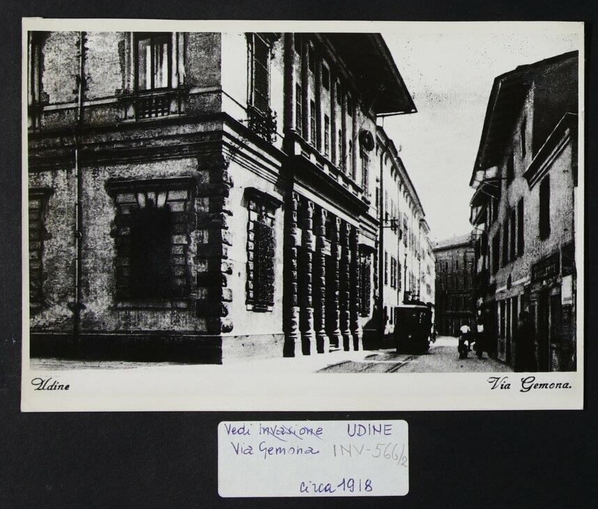 Udine: cartolina riprodotta che rappresenta una parte di via Gemona (porta Gemona interna). A sinistra, Palazzo Antonini-Maseri (sede della Banca d'Italia dal 1900 fino al 2009) realizzato su progetto dell'architetto Andrea Palladio e su commissione dell'aristocratico Floriano Antonini (1556). Si notino inoltre il tram e, a destra, due signori.