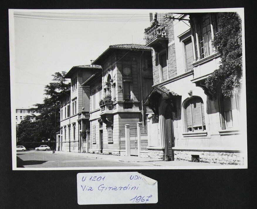 Udine, Giuseppe Girardini: tre residenze realizzate su progetto dell'architetto Ettore Gilberti. Da sinistra: al civico 19, Villa Canciani (1925, impresa esecutrice Fratelli Tonini); al civico 15 Casa Sottocorona (1925, impresa esecutrice Ditta Romolo Tonini), caratterizzata da fregi e una serliana e, al civico 13, Villa Freschi (1924-1925, impresa esecutrice Ditta Romolo Tonini) con la piccola tettoia all'ingresso, affianco l'arco a tutto sesto e la veranda. Queste ville urbane risalgono al periodo di lotizzazione delle aree verdi situate al confine della zona più antica di Udine.