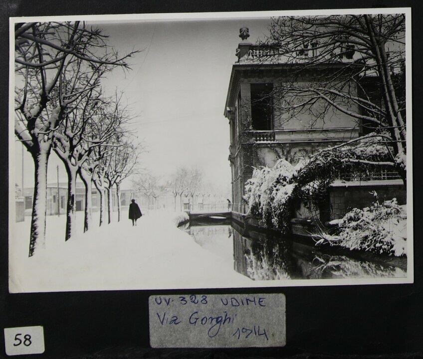 Udine: veduta di uno scorcio innevato di via Gorghi con, a destra, Palazzo Schiavi, realizzato per l'avv. Schiavi su progetto degli architetti Arduino e Ruggero Berlam (1912), e la roggia. A sinistra, accanto al filare di alberi, un uomo di schiena che passeggia.