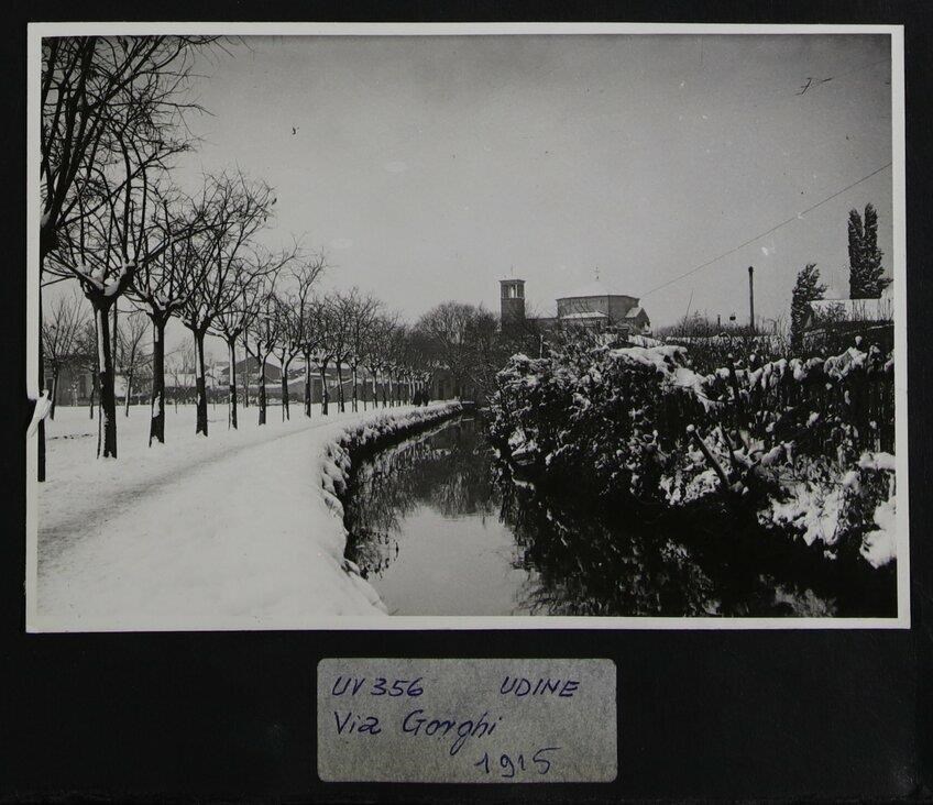 Udine: veduta di uno scorcio innevato di via Gorghi con la roggia. A sinistra, un filare di alberi. Sullo sfondo, verso destra, la chiesa di San Francesco e il campanile (seconda metà del XIII secolo).