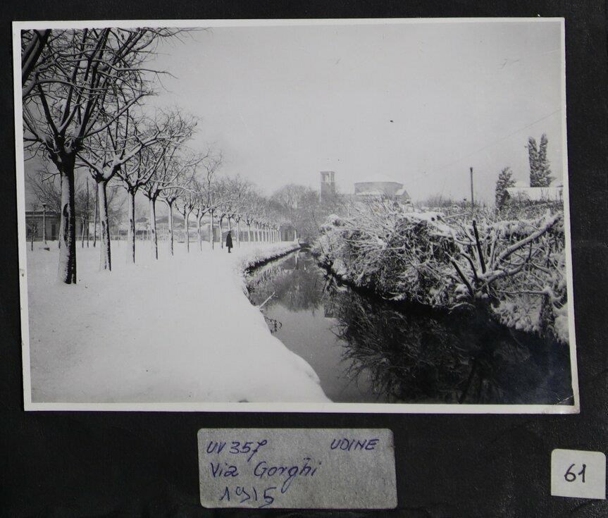 Udine: veduta di uno scorcio innevato di via Gorghi con la roggia. A sinistra, un filare di alberi e un uomo. Sullo sfondo, verso destra, la chiesa di San Francesco e il campanile (seconda metà del XIII secolo).