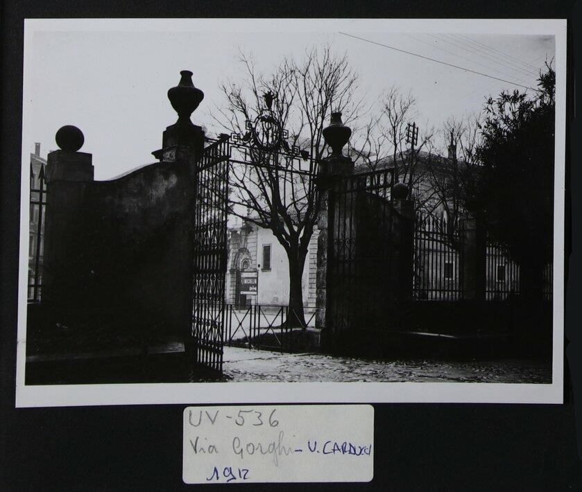 Udine: cancello aperto e palazzo storico tra via Gorghi e via Giosuè Carducci.
