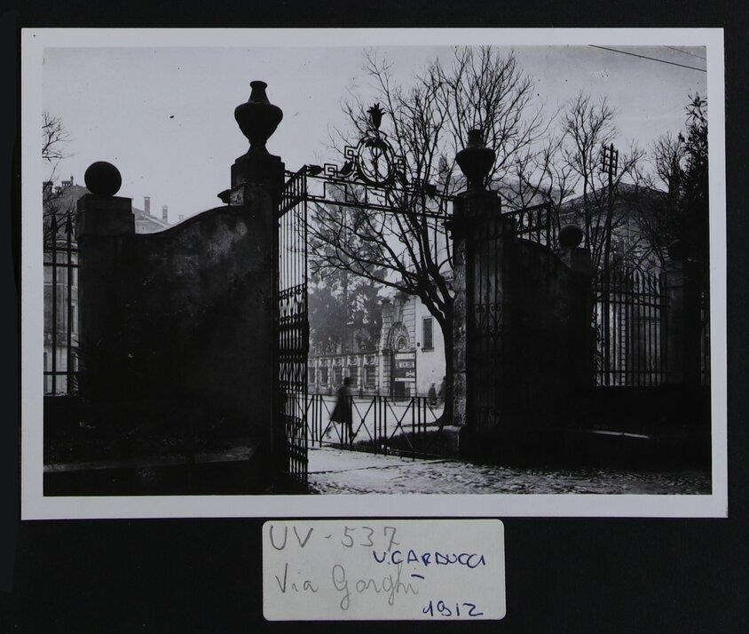 Udine: cancello aperto e palazzo storico tra via Gorghi e via Giosuè Carducci. Si noti la bambina di profilo che sta passeggiando.