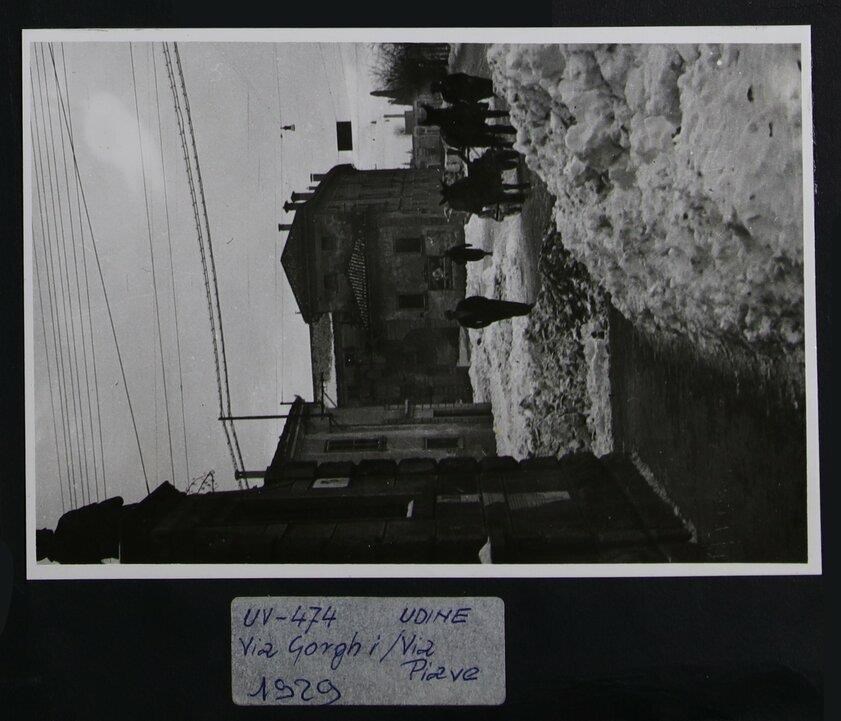 Udine: veduta di uno scorcio innevato di via Gorghi e via Piave con abitazioni, tre uomini e un carro trainato da due cavalli.