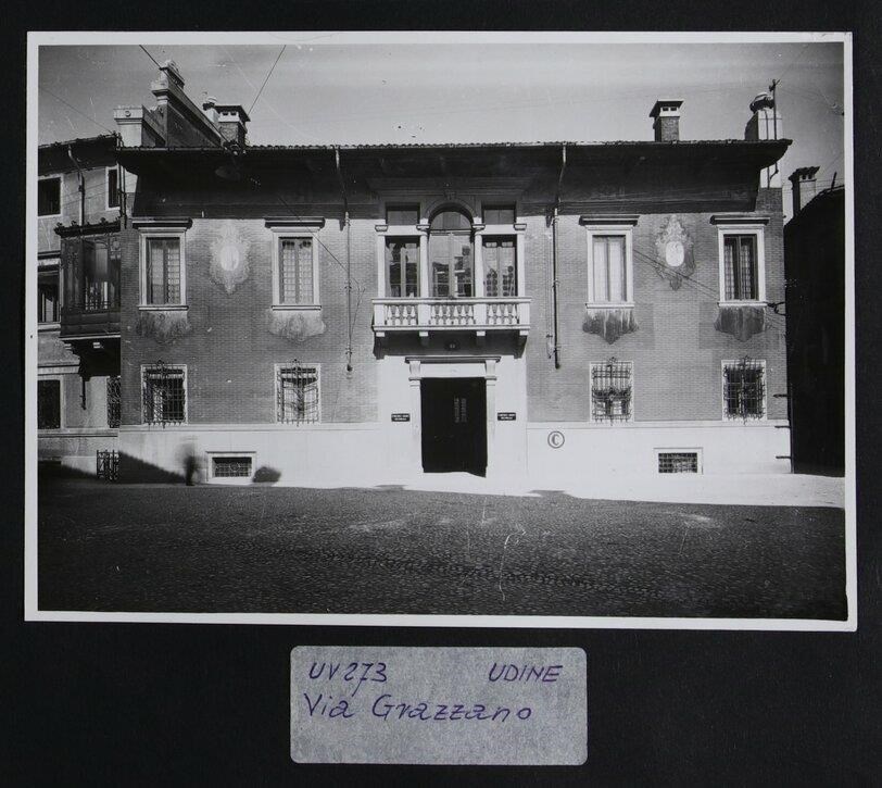 Udine, via Grazzano: veduta della facciata affrescata con trifora di Palazzo Giacomelli (XVI secolo).