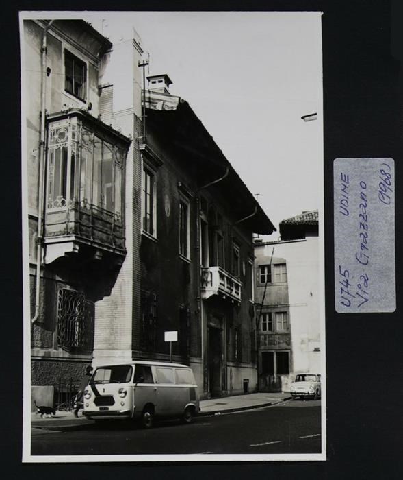 Udine, via Grazzano: veduta prospettiva della facciata affrescata con trifora di Palazzo Giacomelli (XVI secolo). A sinistra, una piccola ed elegante veranda. In basso a sinistra, un furgone Fiat 600 e una signora che passeggia con il suo cane.