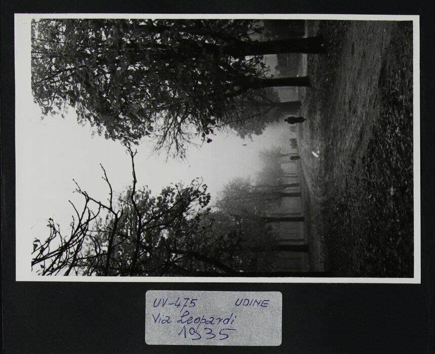 Udine: veduta di viale Giacomo Leopardi con filari di alberi, a destra e a sinistra, e persone che passeggiano. In secondo piano a destra, un cancello.